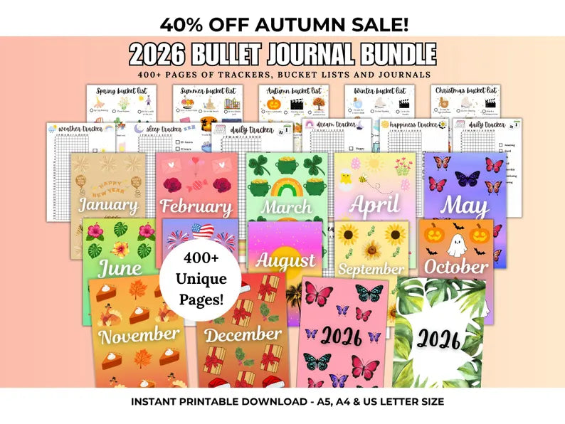 This is a full 2026 Bullet Journal Planner Bundle that comes as a digital PDF file designed for you to print yourself at home. I have designed these pages myself and they are colourful and all themed to each month. This whole bundle is undated meaning you can use it year after year! This is Bundle A.
