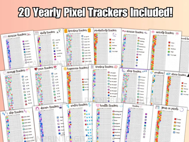 Each month has 30 Matching pages (35 for February to account for the 28 or 29 days). This bundle also contains 20 yearly pixel trackers, 25 2026 title pages and 5 seasonal bucket list pages. So it really is the perfect bundle for a whole years worth of bullet journaling!